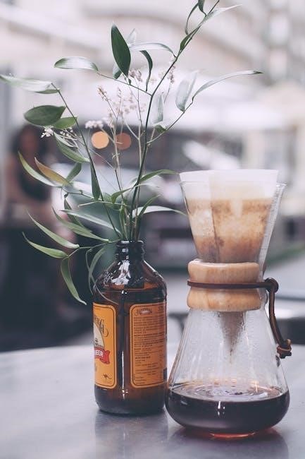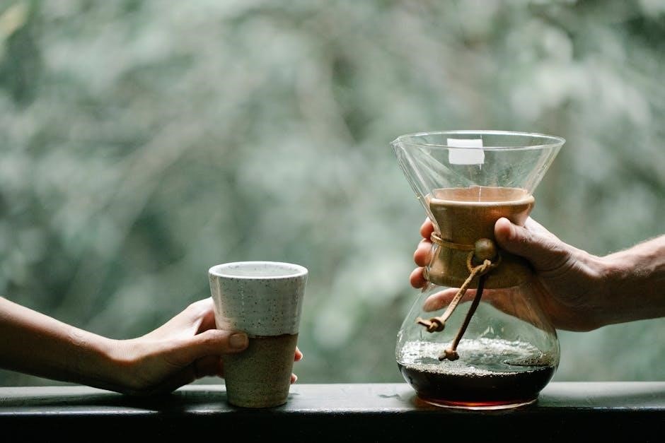 The Chemex Brewer is a glass pour-over coffee maker with a distinctive hourglass shape. It requires specialized paper filters, which are thicker than standard filters, to ensure clean extraction. These filters are designed to remove impurities and oils, resulting in a smooth, balanced cup. The Brewer comes in various sizes, such as 6-cup or 8-cup versions. Always use the correct size of Chemex filter for your Brewer to prevent overflow or under-extraction. Before brewing, rinse the filter with hot water to eliminate any paper taste. Proper use of the Brewer and filters is essential for achieving the desired flavor profile. Regular cleaning of the Brewer ensures optimal performance.